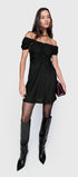 Our Devin Off Shoulder Dress is combines romance and ease with its playful cap sleeves and subtle ruched detailing. This mini dress features a metallic shimmer and simple design, making it a unique wardrobe staple.